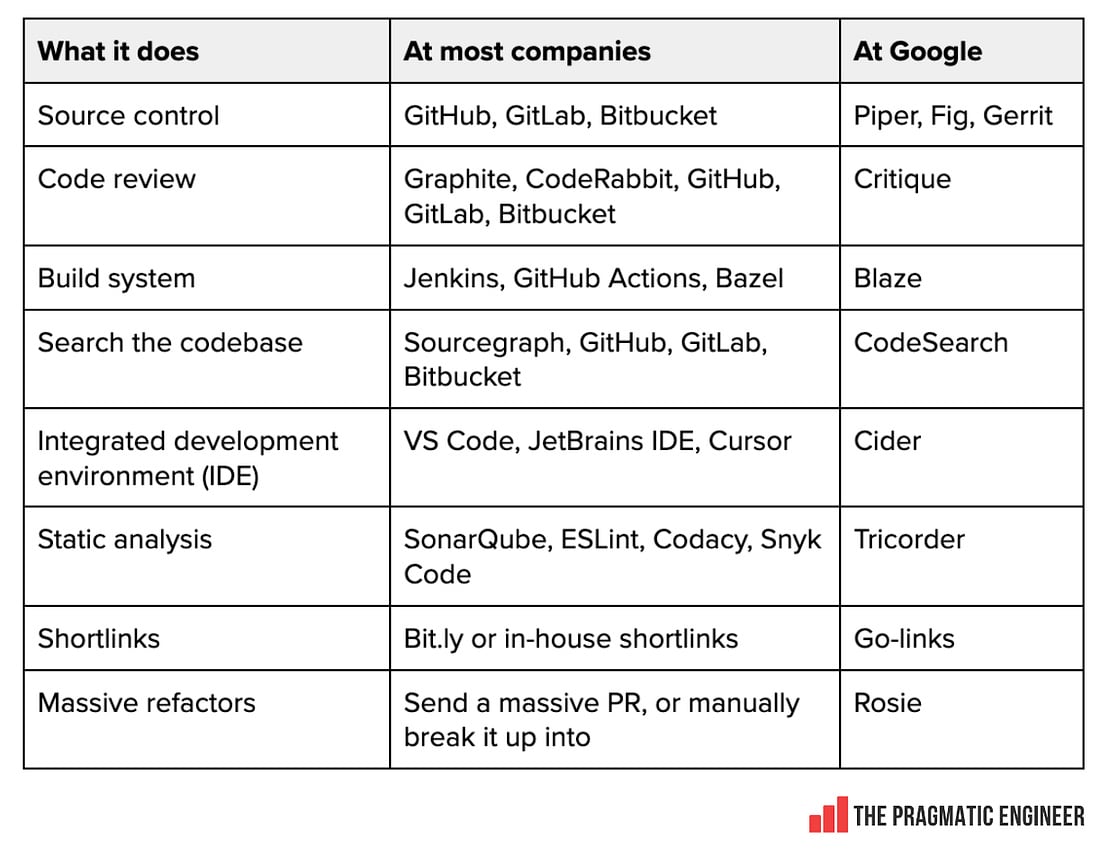 Google’s infrastructure is distinct from every other tech company because it’s all completely custom: not just the infra, but also the dev tools. Google is a tech island, and engineers joining the tech giant can forget about tools they’re used to – GitHub, VS Code, Kubernetes, etc. Instead, it’s necessary to use Google’s own version of the tool when there’s an equivalent one.