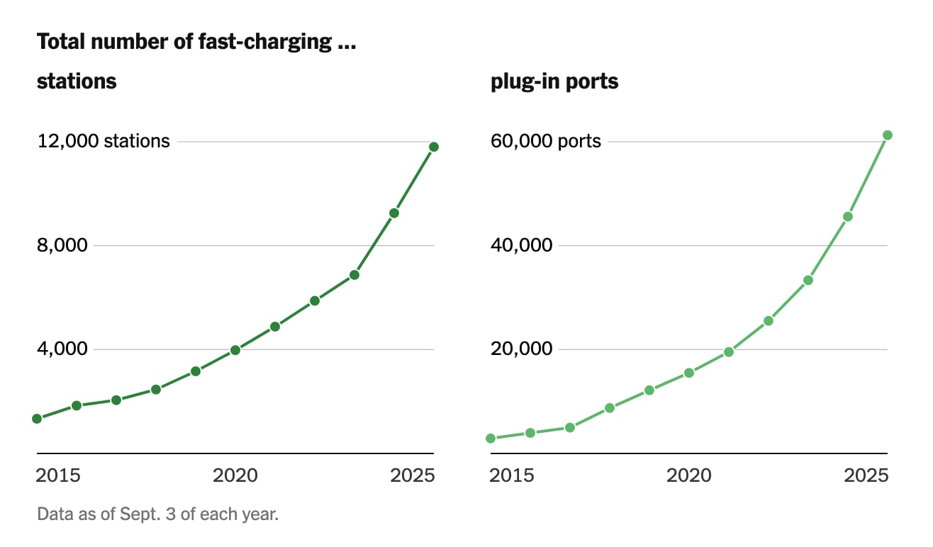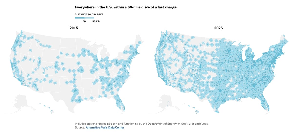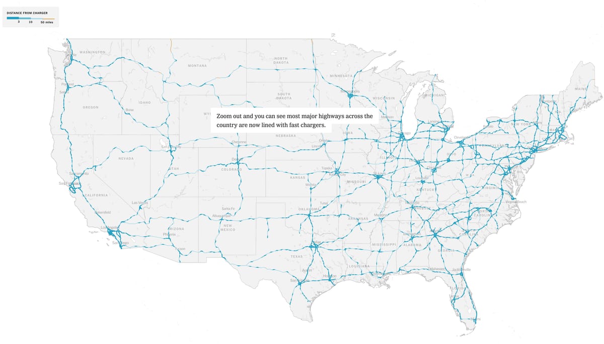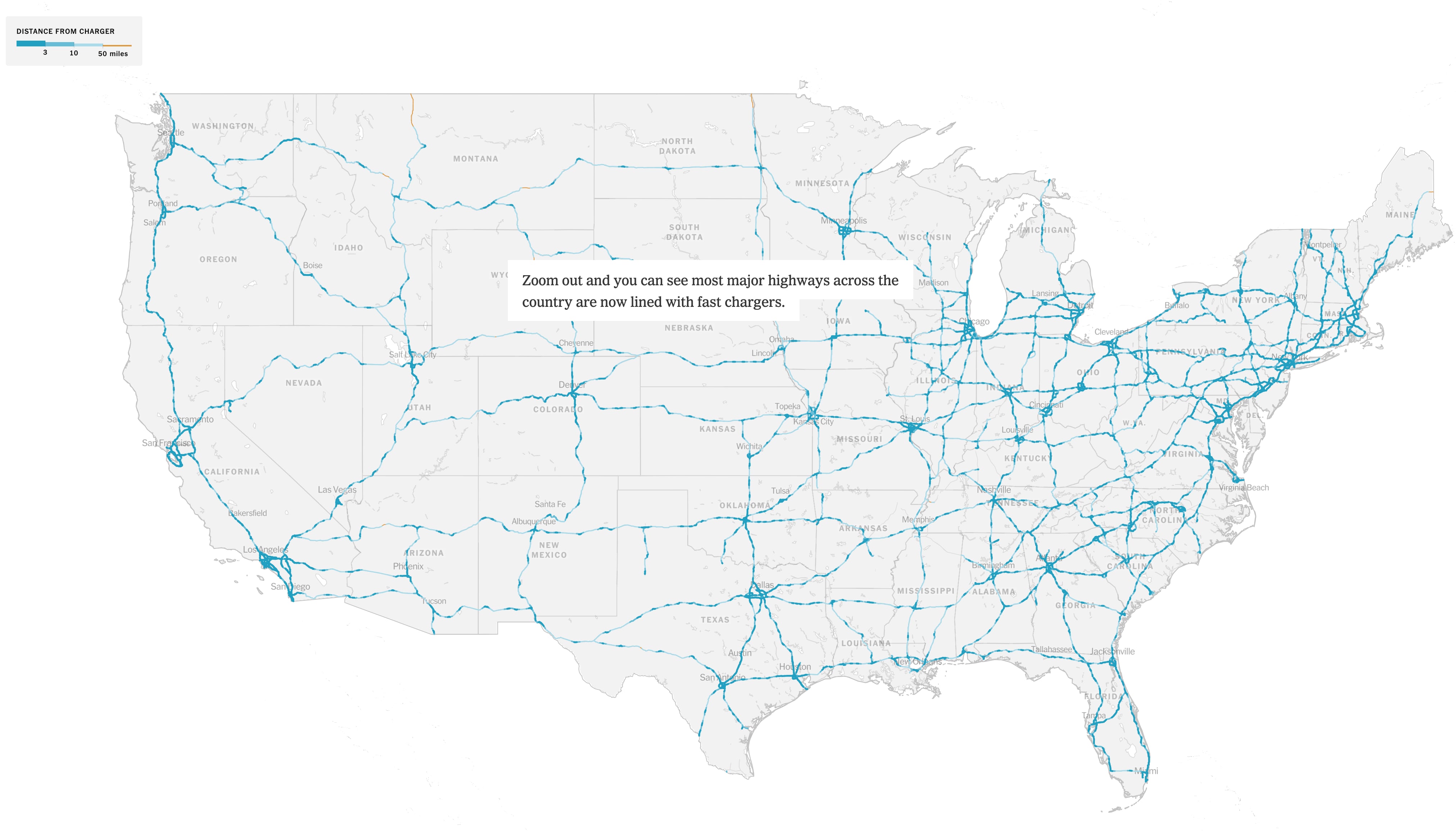 Straordinario lavoro del New York Times per visualizzare i progressi della rete di ricarica ad alta potenza delle auto elettriche: See How E.V. Road Trips Went From Impossible to Easy.