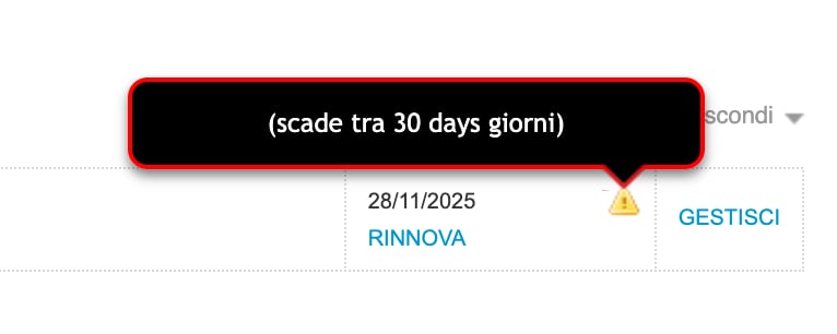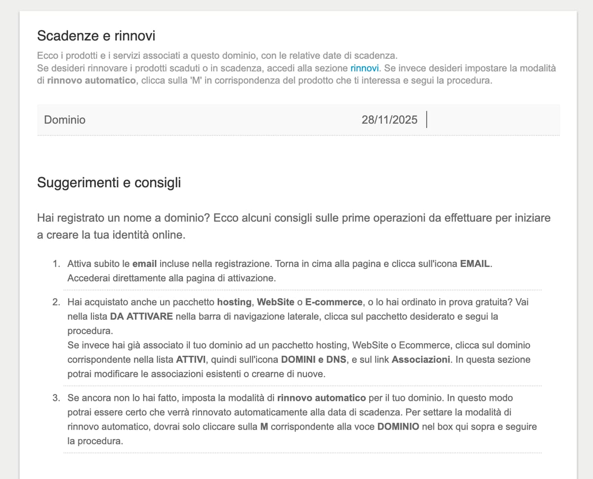"Per settare la modalità di rinnovo automatico, dovrai solo cliccare sulla M corrispondente alla voce DOMINIO nel box qui sopra e seguire la procedura."