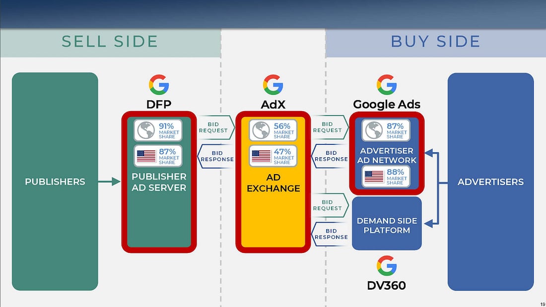 Instead of individual websites selling ad space, they hire a service to manage their space for them. This is a “publisher ad server,” and it has a large inventory of websites looking to sell space, which is why we’ll call it the “sell side” for short. On the “buy side” is an “advertiser ad network,” which similarly has a large inventory of advertisers looking for space to post ads. (Judge Brinkema found Google not liable for illegally monopolizing the buy side.)