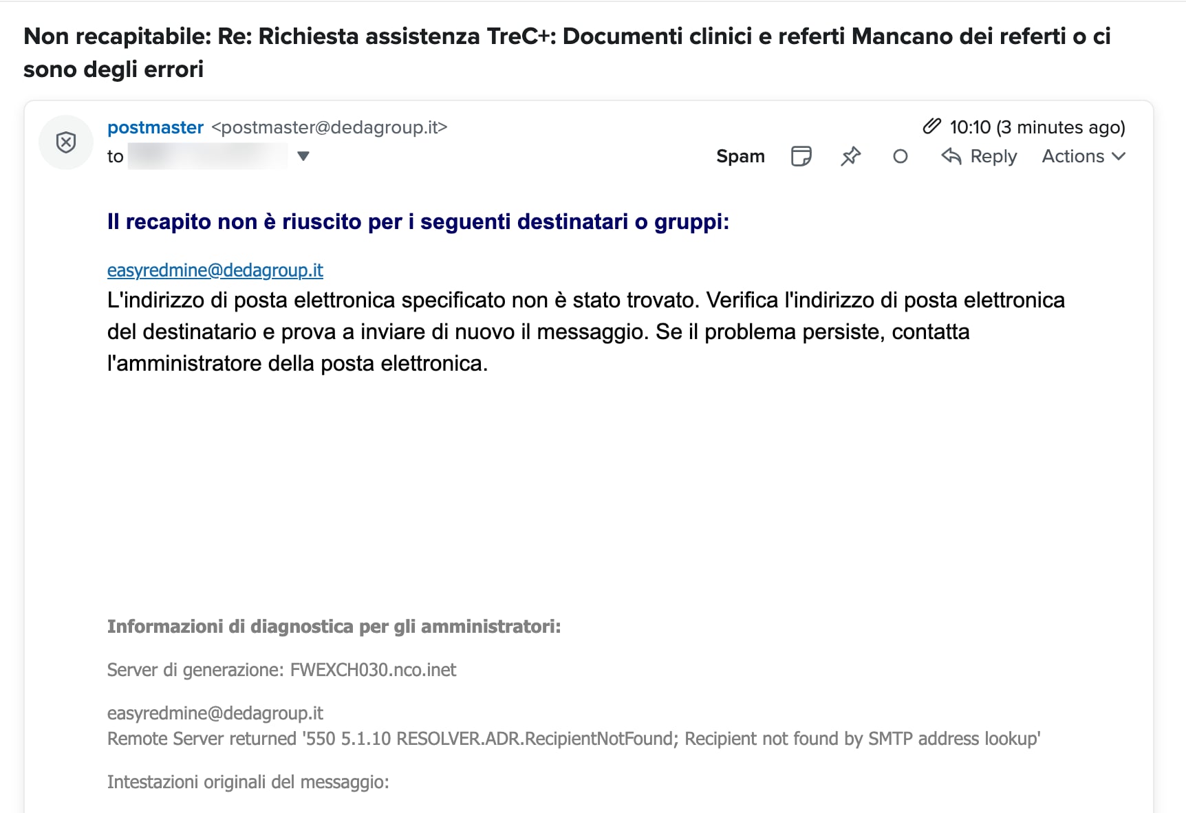 Le email di risposta dell'assistenza TreC+ (fascicolo sanitario elettronico della provincia di Trento) arrivano da supporto.trec@dedagroup.it: