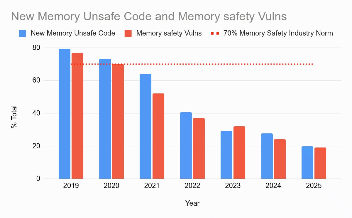 Our historical data for C and C++ shows a density of closer to 1,000 memory safety vulnerabilities per MLOC. Our Rust code is currently tracking at a density orders of magnitude lower: a more than 1000x reduction.