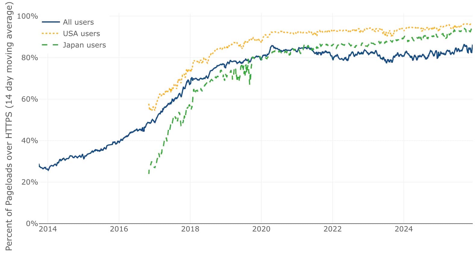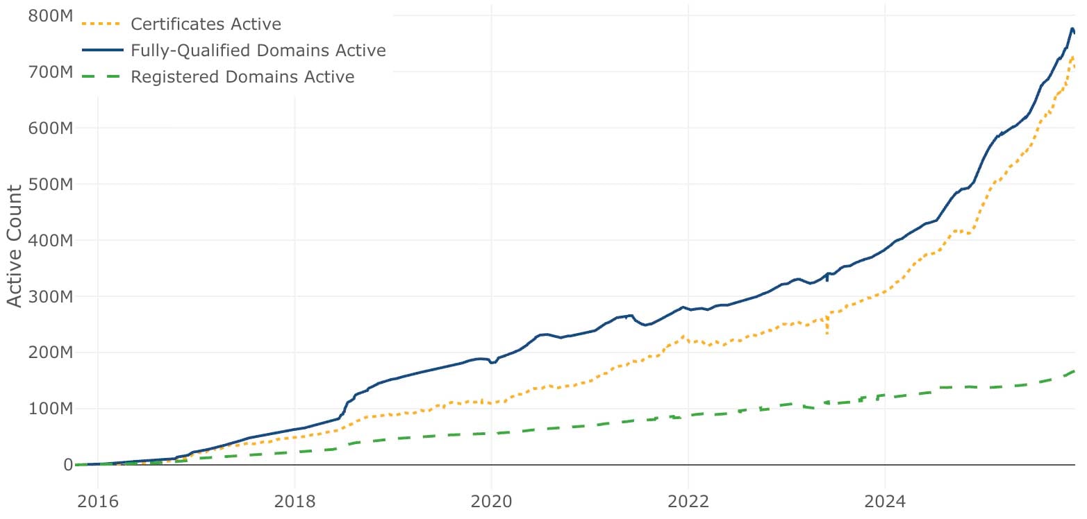 In March 2016, we issued our one millionth certificate. Just two years later, in September 2018, we were issuing a million certificates every day. In 2020 we reached a billion total certificates issued and as of late 2025 we’re frequently issuing ten million certificates per day. We’re now on track to reach a billion active sites, probably sometime in the coming year.
