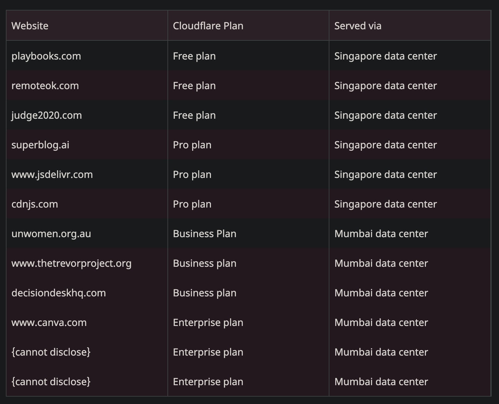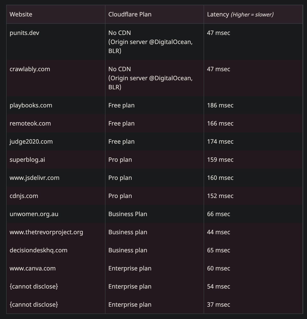 Altra testimonianza di come il routing Cloudflare sia pessimo sui piani più economici (producendo 150+ ms di latenza evitabile scegliendo nodi a migliaia di km di distanza), un problema che essenzialmente non esiste con le altre CDN: