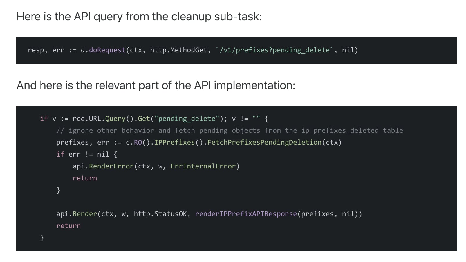 pending_deletewith no value, the result ofQuery().Get(“pending_delete”)here will be an empty string (“”), so the API server interprets this as a request for all BYOIP prefixes instead of just those prefixes that were supposed to be removed.