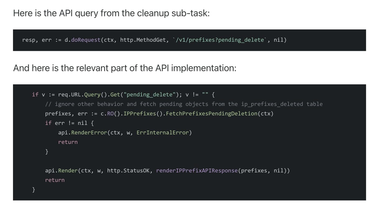 Certo è che se uno progetta un endpoint di un'API mission critical dandogli un formato così strambo e fuori da ogni best practice (/v1/prefixes?pending_delete) un po' se le cerca.