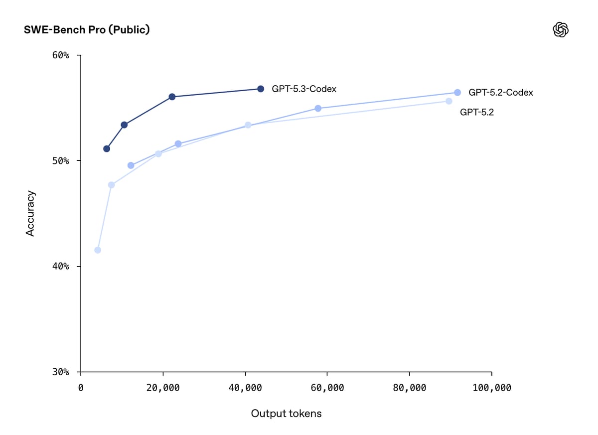 I progressi degli LLM nella programmazione sono ancora impressionanti. GPT-5.3 Codex supera la precedente versione nel benchmark SWE-Bench Pro pur usando la metà dei token di output (ragionamento incluso) e costando quindi (circa) la metà.